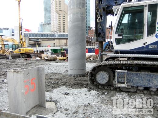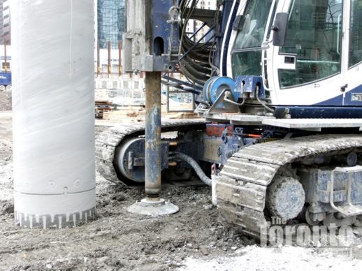 While the pile driving machine prepares the Southcore site for excavation, another huge construction project is underway nearby — the Union Station railway platform revitalization project (the covered area at the rear left side of the photo).