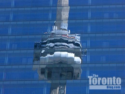 February 18 2011: A Simcoe Street view of the CN Tower reflecting in the west windows of the new PricewaterhouseCoopers office building.