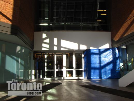 … well over a year after construction of the3-storey glass and steel cube structure commenced. The entrance area is seen here on November 11 2010, several weeks after work started as part of a $34-million building revitalization project.
