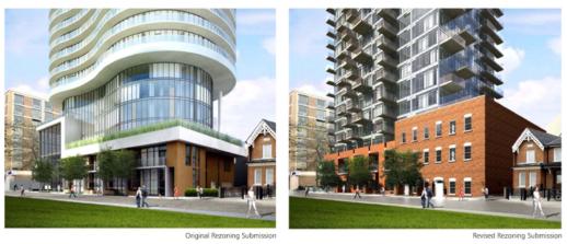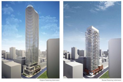 From the City of Toronto website, artistic renderings of the original (left) and the revised Nicholas Residences condo tower. Instead of the curvaceous Figure-8-shaped 44-floor tower initially proposed, a 35-storey condo will be built.
