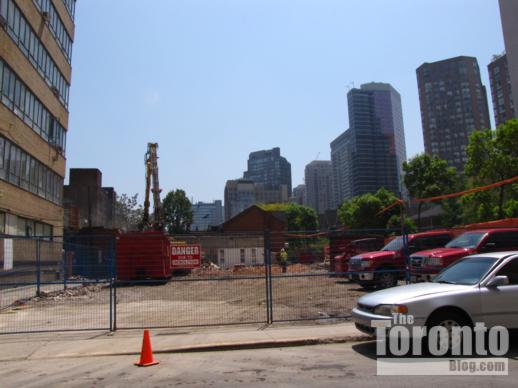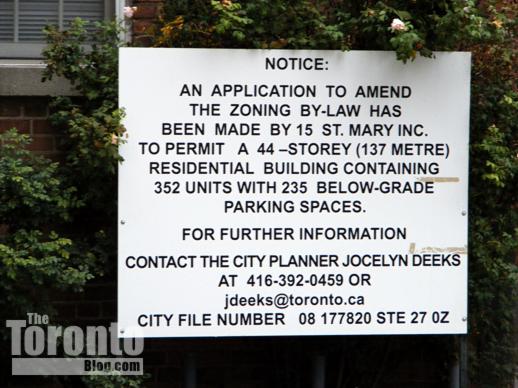 In a September 24 2009 report, city planning staff recommended a 29-storey condo be approved on certain conditions, including payment of $685,000 toward capital improvements to nearby Queen’s Park along with streetscape improvements to St Mary and St Nicholas Streets. Toronto and East York Community Council adopted the report at their meeting on October 13 2009; their decision was reported in an October 14 2009 article in the Globe and Mail. The rezoning application subsequently was approved at the October 26 2009 meeting of Toronto City Council. But that didn’t end conflict between the local community and the condo developers.