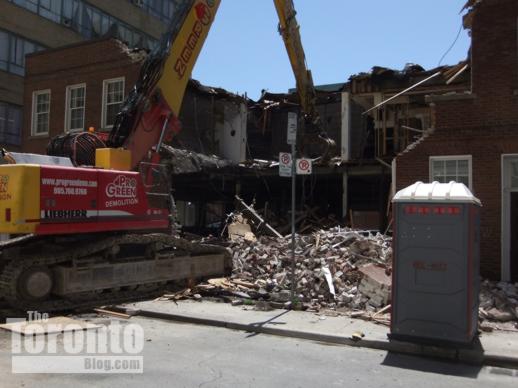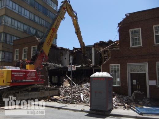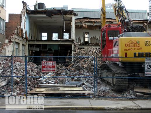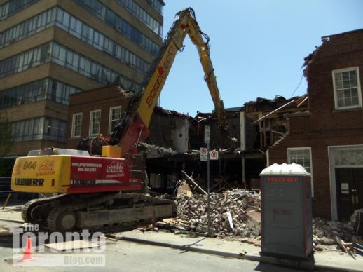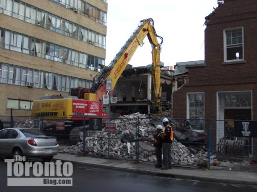 April 1 2011: The Nicholas Residences highrise will tower above these buildings which front on Yonge Street. The building at left houses a Flight Centre travel agency, while the one at right is Zelda’s restaurant (the tacky structure with the sloped roof shelters an outdoor dining terrace).