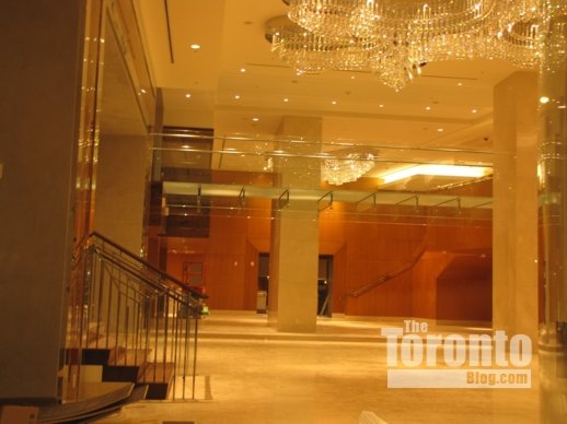 Some construction work is still in progress, as crews rush to complete the hotel entrance, lobby and lobby bar. Work continues on many of the ultra-expensive condo suites in the tower’s upper levels while, on the exterior, the hotel’s signage has still not been installed, and work is finishing up on a wide walkway between the Ritz-Carlton and the CBC headquarters to its west.