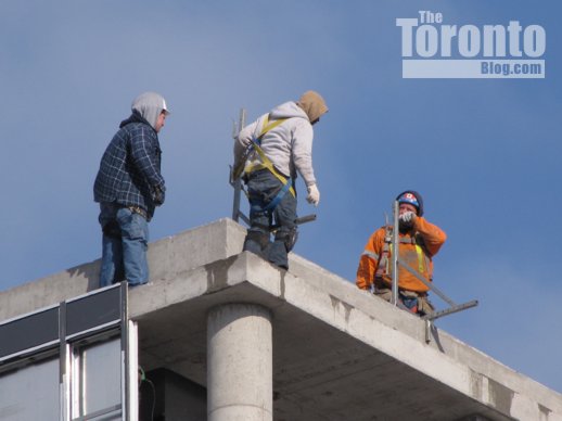 Three Hundred Front Street West, a project of Toronto’s Tridel group of real estate development and management companies, is an L-shaped condo-loft complex being built at the northwest corner of Front and John Streets, just north of the CN Tower. The condo tower will soar 49 storeys above the street, while the loft section of the building will rise just 15 floors.  As of last week, the tower was approaching the halfway mark, while work on the midrise loft wing had reached the 12th level.