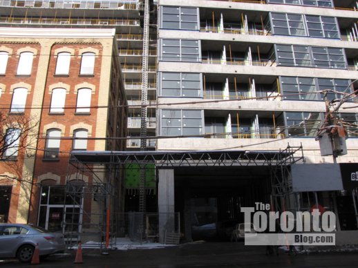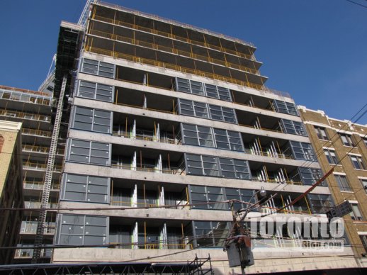 A project of Cresford Developments, Lofts 399 is being built on the south side of Adelaide Street between the two Quad Lofts condos, and will sit back-to-back to the new Victory Condos on King West. My February 20 2011 post has several photos showing earlier construction progress at Lofts 399 and its proximity to the other condos.