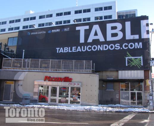Tableau condos sign on the warehouse building where the condo tower will eventually rise