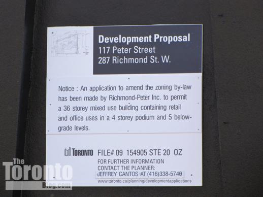 New proposal sign (seen here Feb. 3 2011 on Richmond Street) drops reference to a hotel and calls for a taller tower with condos plus retail and office space.