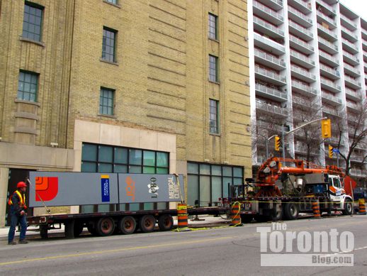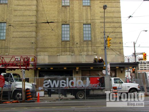 Scores of construction crews have been buzzing around the inside and outside of the building this week, hurrying to finish the store in time for its much-anticipated and months-overdue opening. Today, crews were installing Loblaws signage atop a new canopy at the southeast corner of the Gardens, where the grocery store entrance is situated, as well as working on the underground parking garage entrance at the southwest corner of the building. Work also is continuing on the new Maple Leaf Gardens marquee along Carlton Street, and inside the upper levels of the Gardens, where the new Ryerson University Athletics Centre is being built. (Unlike the grocery store, the sports & recreation complex is not scheduled for completion until next spring.)