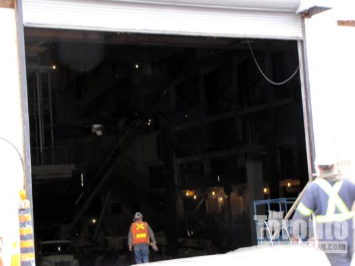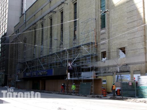 Below are photos of the Student Learning Centre site this morning as well as a rendering, from the Ryerson University website, suggesting how the centre’s retail facade on Yonge Street will look. Renderings of the building interior can be viewed in my April 8 2011 post about the project, while earlier photos of the building site — including the iconic Sam the Record Man store that previously occupied the property — can be viewed in my February 15 2011 post.