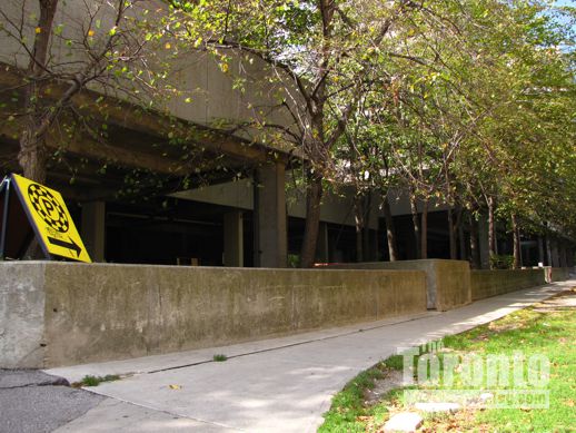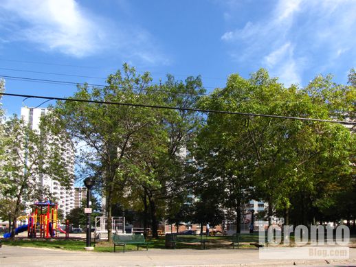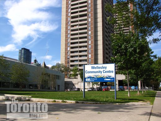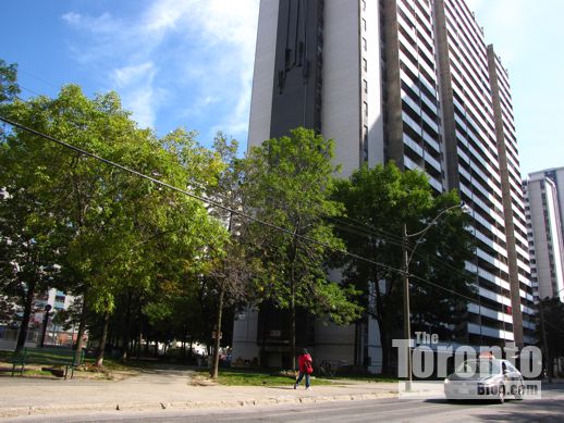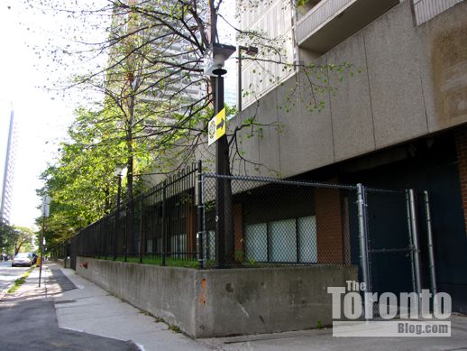 Looking east toward the Bloor-Parliament intersection, from the field next to 76 Howard Street.Two of the towers would be built here.
