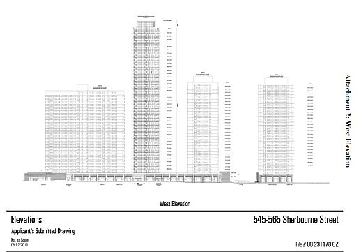This architectsAlliance illustration of the Block 3 tower elevations appears in application documents filed with city planners. These towers would stand between Edgedale Road at the west and Parliament Street to the east.