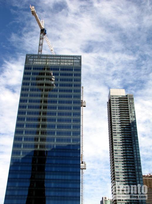 February 18 2011: A Simcoe Street view of the CN Tower reflecting in the west windows of the new PricewaterhouseCoopers office building.