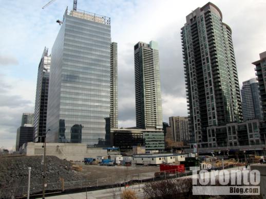 January 3 2011: Northwest view of the Southcore Financial Centre location for the Delta hotel and Bremner Tower. Overlooking the site are the PwC tower and Telus Tower at left, Maple Leaf Square towers (center), and the Infinity condos.