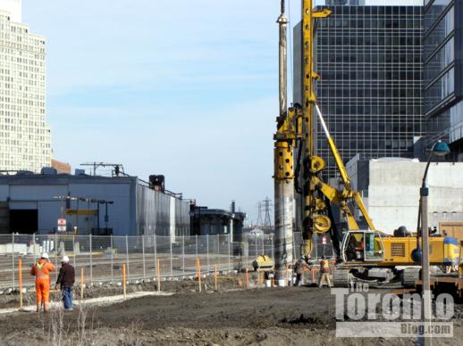 While the pile driving machine prepares the Southcore site for excavation, another huge construction project is underway nearby — the Union Station railway platform revitalization project (the covered area at the rear left side of the photo).