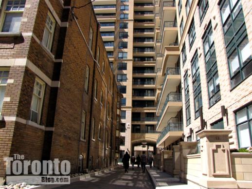 In a September 24 2009 report, city planning staff recommended a 29-storey condo be approved on certain conditions, including payment of $685,000 toward capital improvements to nearby Queen’s Park along with streetscape improvements to St Mary and St Nicholas Streets. Toronto and East York Community Council adopted the report at their meeting on October 13 2009; their decision was reported in an October 14 2009 article in the Globe and Mail. The rezoning application subsequently was approved at the October 26 2009 meeting of Toronto City Council. But that didn’t end conflict between the local community and the condo developers.