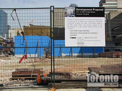 I’m sure the whole process has been held up by events during the last two months on the south side of Gould Street, where the historic Empress Hotel building at 335 Yonge Street burned down in a fire that investigators determined was caused by arson. I’m pissed that 335 Yonge was neglected and allowed to languish, and I’m even more angry that the building had to be demolished because of the irreparable damage it suffered both from the fire and subsequent investigation procedures. Now that the beautiful heritage building is gone forever, I hope the property lands in Ryerson’s hands, so the site can be developed into an impressive Yonge Street gateway to the university’s downtown campus. (I definitely don’t want to see 335 Yonge’s owners get city approval to build a condo tower there.)
