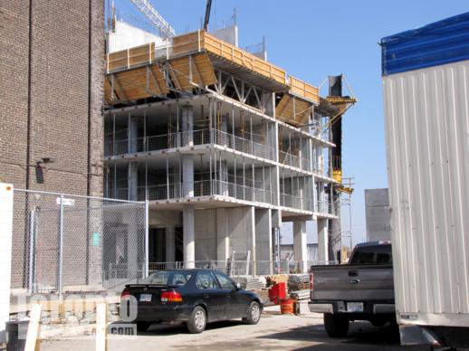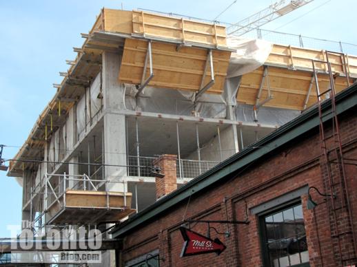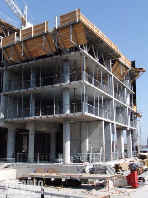 June 21 2011: Construction of the Clear Spirit condo tower climbs above The Case Goods Warehouse building