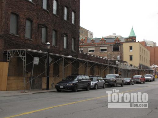 Lower Church Street view of The Berczy condo site on March 7 2011: Demolition progress means much of the Flatiron building is now visible across the site…