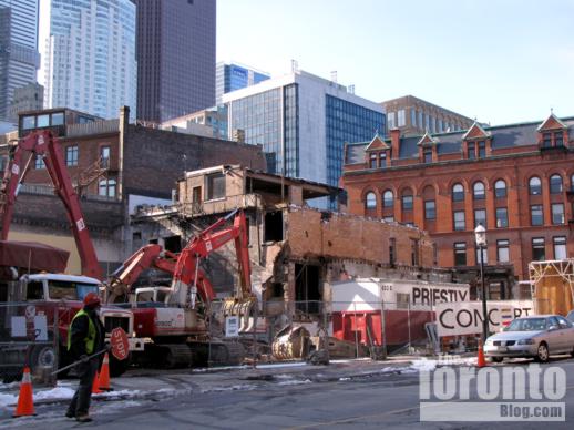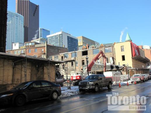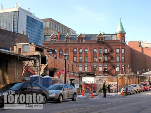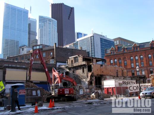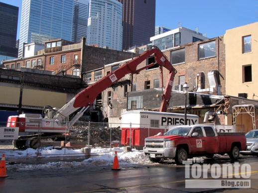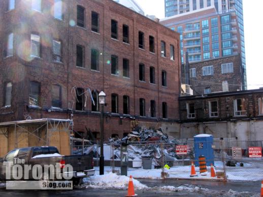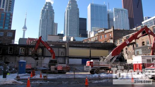 Lower Church Street view of demolition activity on February 3 2011. Only the rooftop of the Gooderham Flatiron Building on Front Street is visible.