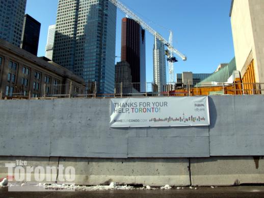 March 9 2010: Hoarding along the Yonge Street sidewalk next to the L Tower construction site; note that exterior work has finished on the nearby London on the Esplanade condo building behind the Sony Centre
