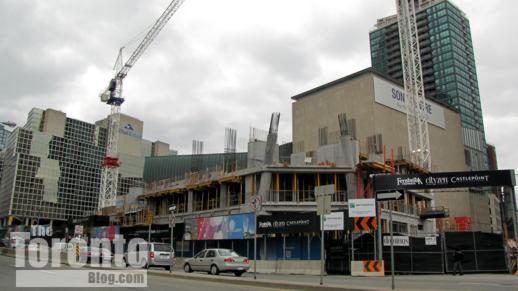 But the L Tower’s problems continued beyond the cancellation of the podium museum project. Funds from the condo tower development were going to be used to revitalize the 50-year-old Sony Centre (originally called the O’Keefe Centre, and more recently the Hummingbird Centre.) The Sony Centre’s desperately-needed interior upgrades were supposed to begin in 2007; however, the renovation work got pushed to the fall of 2009. Part of the delay was due to difficulties in arranging financing during the global recession, while it also took time for the developer to resolve various outstanding issues with the city. In an Oct. 21 2009 story in the National Post, former Toronto Mayor David Miller is quoted as saying: “You’re building a very significant new condominium building above a heritage building. That’s complicated, the financing is complicated and the neighbourhood consultation was complicated… There were 27 public meetings.”