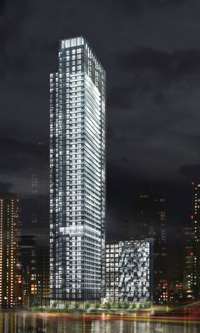 From the Tridel website, an artistic illustration of a southeast night view of the Three Hundred Front Street West condo building