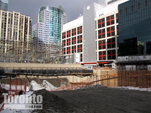 November 23 2010: Northeast view of the condo construction site. The building with the red window frames is the CBC broadcasting headquarters on the southeast corner of Front & John Streets.