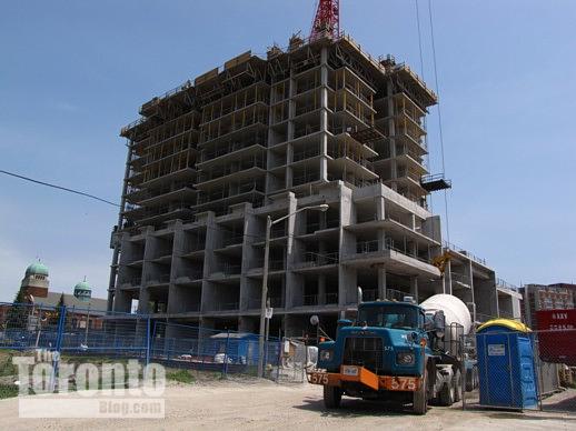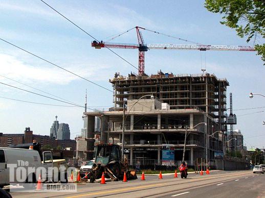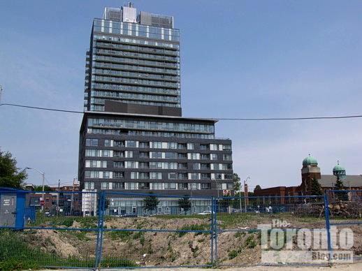 June 21 2011: The Paintbox Condominium tower has risen to 11 storeys behind the Regent Park Arts and Cultural Centre on Dundas Street …