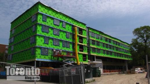 Going green on Oak Street: A brilliant green building in Regent Park grabbed my attention yesterday when I was visiting a friend in an east-facing condo on Homewood Avenue. The bright green surface actually is insulation applied to the outside walls of the new Toronto Christian Resource Centre, which is under construction at 40 Oak Street. But the building won’t stay green for long: it’s soon going to get a brown brick exterior. The white highrise behind the TCRC is the new One Park West condo, which is approaching the end of construction (it appears that the crane has been removed from its roof). Below is another pic from yesterday, as well as additional recent photos of the TCRC, One Park West, and other construction activity in Regent Park, which I profiled in a March 4 2011 post.