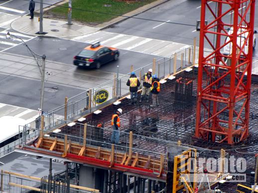 November 30 2011: Workers walk on rebar two levels above University Avenue
