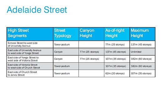 The study determined that tall buildings are appropriate for 17 downtown streets: University Avenue/Avenue Road; York Street; Bay Street; Yonge Street; Church Street; Jarvis Street; Bloor Street; Wellesley Street; College/Carlton Street; Gerrard Street; Dundas Street; Queen Street; Richmond Street; Adelaide Street; King Street; Wellington Street; and Front Street. High streets are indicated in blue on the maps below: