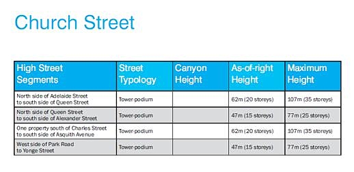 The charts below, also from the City’s Tall Buildings Study webpage, outline street typologies and height recommendations for specific designated high streets: