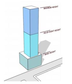 For the designated high streets, the consultants recommended that the City impose a three-tiered height limit for new building construction: a “base building height,” an “as of right” height, and a “maximum” height. The “base height” would be equal to the width of the high street on which the property has frontage. The “as of right” height would be based on prevailing heights of existing buildings nearby. Based on all recent building approvals, the “maximum” height would be available only through a “site-specific rezoning” that would require the building developer to provide what are known as Section 37 community benefits. The actual value of those benefits would be based upon the additional increase in building density that would accompany the increase in height between the “as of right” and “maximum” heights.