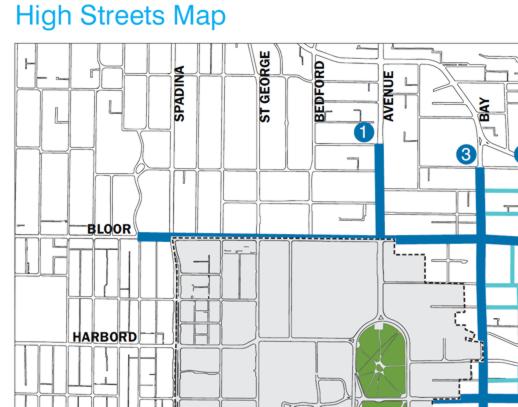 High streets to the north and west of Queen’s Park include Bloor and Bay and part of Avenue Road, as marked on this map from the City’s Tall Building Study webpage