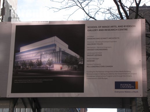 The university is in the midst of a massive renovation and total transformation of its School of Image Arts building at the southwest corner of Bond and Gould Streets. As part of the redevelopment project, which began last year and continues until September 2012, the Ryerson Gallery and Research Centre will be incorporated into the new facility.