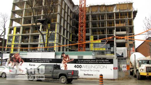 9 up, 2 to go: One year ago, excavation work was just in its early stages at the 508-516 Wellington Street West site of the boutique Downtown condo building. As of this week, concrete has been poured for 9 floors of the 11-storey midrise structure.