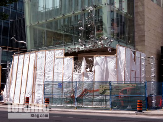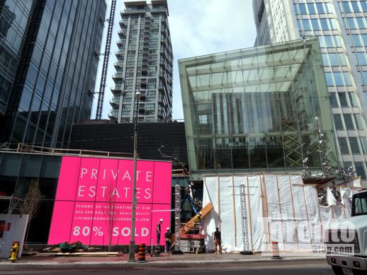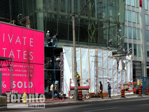 But the Shangri-la won’t need the pink signs to get attention once more of its striking blue windows are put in place. Glass has enclosed just part of seven lower floors so far, but already the windows are creating some eye-catching colours, textures and reflections. That’s especially the case on the University Avenue side of the tower, where just several panes of creased glass suggest how stunning the tower’s tall and sharply angled east and west glass walls will appear when finished.