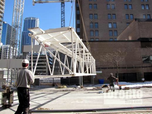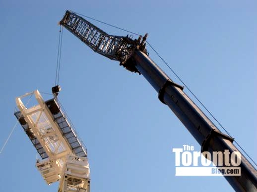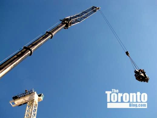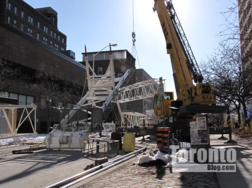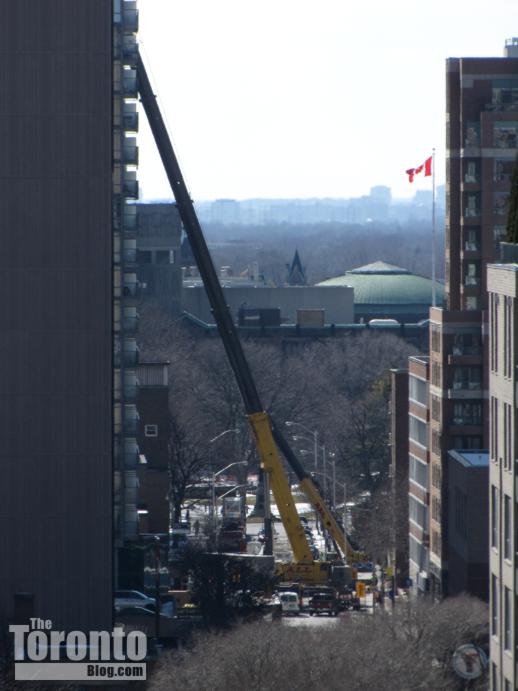 March 26 2011: It took the entire day on Saturday for these two portable cranes on Grosvenor Street to install a second construction crane on the Women’s College Hospital building site.