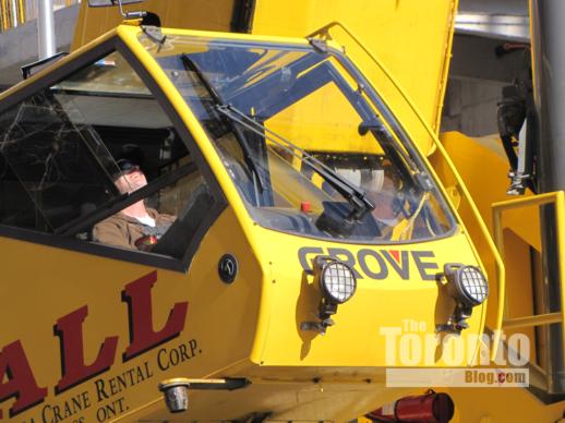 March 26 2011: The operator of the portable crane that lifts segments of the new construction crane into place above the hospital building site.