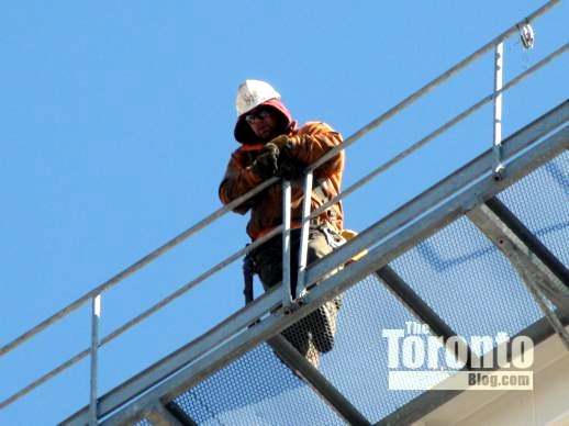 March 26 2011: A worker waits on the partially assembled crane platform while the next piece of the construction crane is hoisted up from Grosvenor Street.