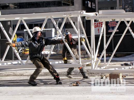 March 26 2011: Workers maneuver a crane segment on Grosvenor Street
