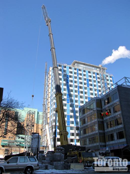 March 7 2011: Two portable cranes remove segments from the main construction crane that helped build the YWCA Elm Centre apartment building