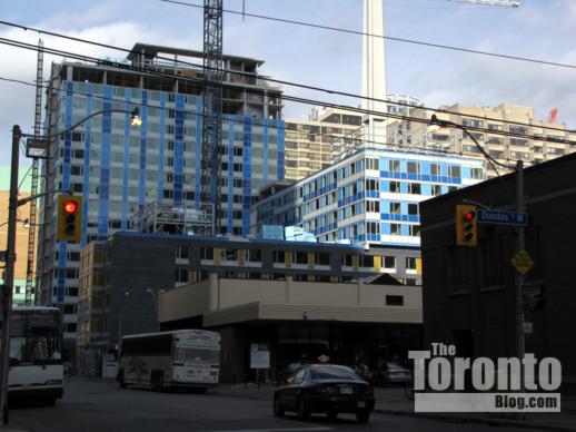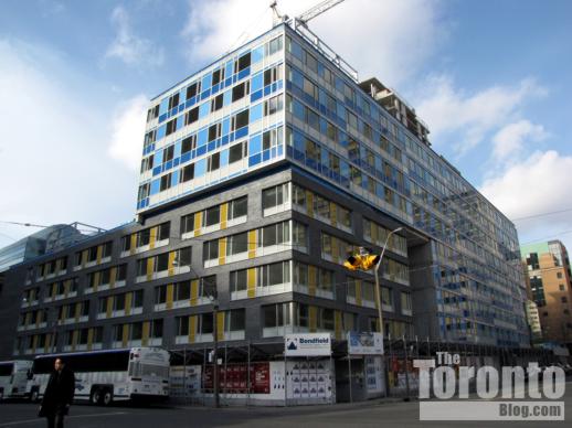 Project completion looms closer: You can’t miss the new YWCA Elm Centre apartment building at the corner of Elizabeth and Elm Streets downtown, and not just because it’s located between two very busy downtown landmarks: the Hospital for Sick Children and the Toronto bus terminal. Thanks to the bright blue window and wall panels accenting its 17-storey tower on Elm Street and most of its 10-storey wing along Elizabeth, the Centre is highly visible for blocks in several directions.