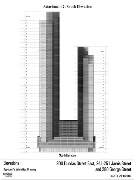 This illustration in a city planning department report shows the south elevation for the proposed 48- and 35-storey condo towers