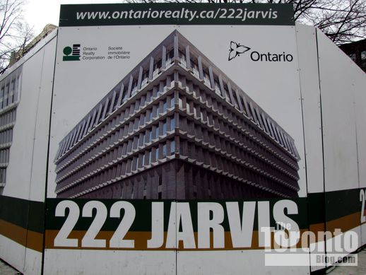 March 22 2011: A sign on hoarding lining the sidewalks around 222 Jarvis Street. Renovation and retrofitting of the 455,000 square foot edifice commenced in late 2009 and is expected to conclude sometime this fall. Government workers could begin moving into the building as early as December.